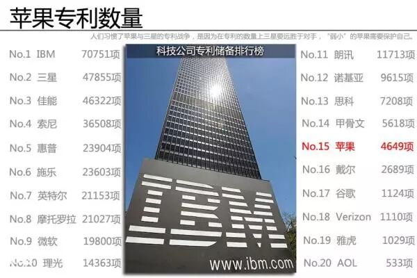 谁也不敢断言什么事情,但是专利究竟对于商业竞争的决定性意义究竟有多大,这个问题似乎并没有标准答案。一个很显然的案例是,苹果的专利数量就比不过IBM、三星和微软,而且差距还挺大的。