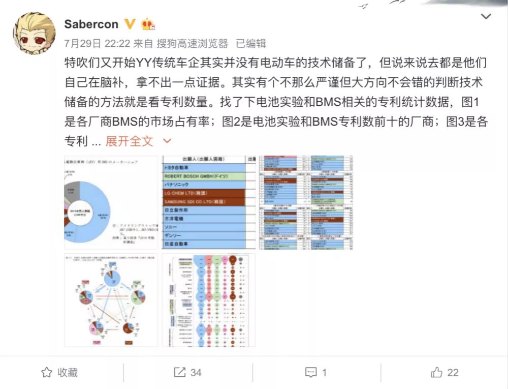 传统车企支持者阵营有一个很强力的理论依据,就是专利数量。网友「Sabercon」在微博里详细列出了这一论据。